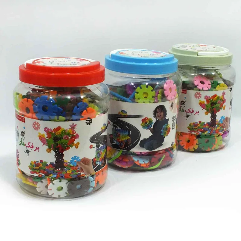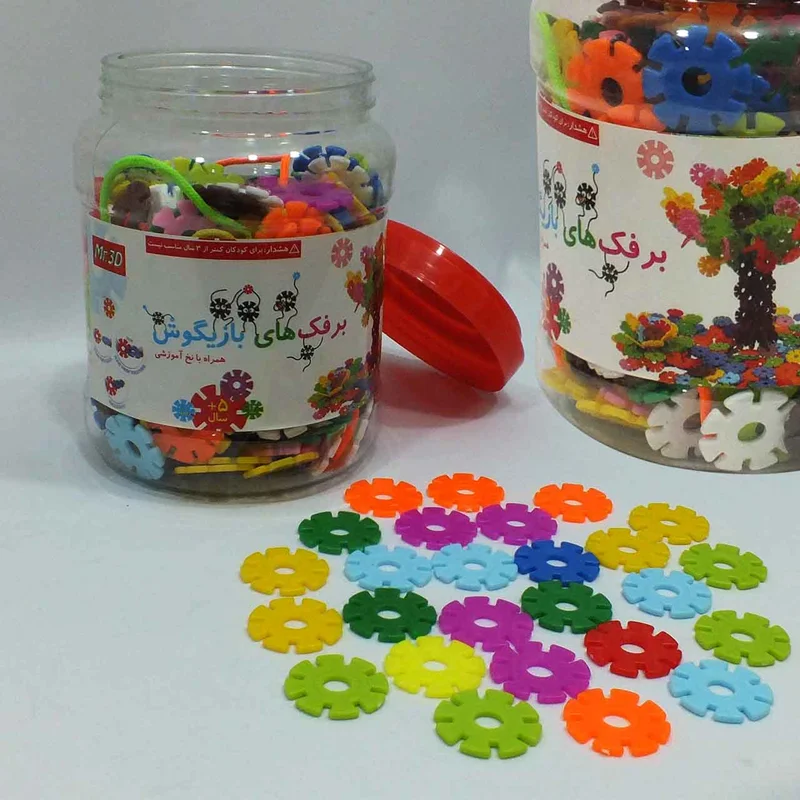 بازی برفکهای بازیگوش حاوی ۴۰۰ قطعه برفک با ۱۴ رنگ مختلف میباشد و کودک با استفاده از آنها میتواند بیشمار شکل مختلف را بسازد.