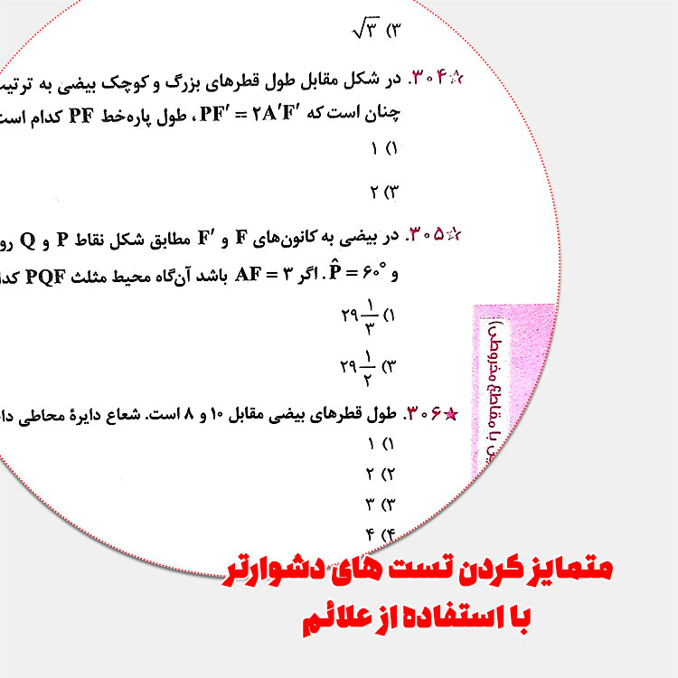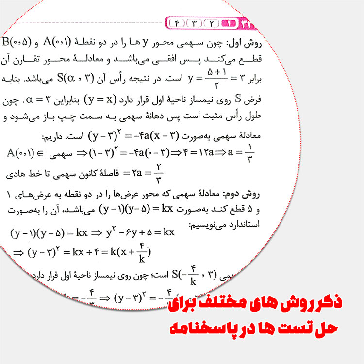 چون این کتاب کاملاً تستی و کاملاً تشریحی نیست، در حل تستها با دوگانگی زیادی مواجه هستیم. در بعضی موارد با نکات تستی در پاسخنامه تحت عنوان «نکته» مواجه هستیم و در بسیاری از موارد نظیر «محاسبه خروج از مرکز بیضی»، سوال 303 کتاب و یا «وضعیت خط و دایره» از بیان نکتههای تستی رایجی که در بسیاری از کتابها موجود است، صرف نظر شده و حل به روش عادی و منطبق با مطالب و راه حلهای موجود در قسمت درسنامه صورت گرفته است.