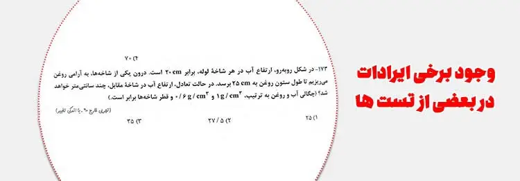 در برخی تست ها نیز ایراداتی وجود دارد، به طور مثال در تست 173 فصل دوم، یکسان بودن قطر لوله ها ذکر نشده و این نکته یک غلط علمی به حساب می آید. در انتهای هر فصل تعدادی تست دشوار تحت عنوان سری Z وجود دارند که مخصوص دانش آموزان قوی تر است. در این تست ها از ایده های جدید و سطح بالاتر استفاده شده.